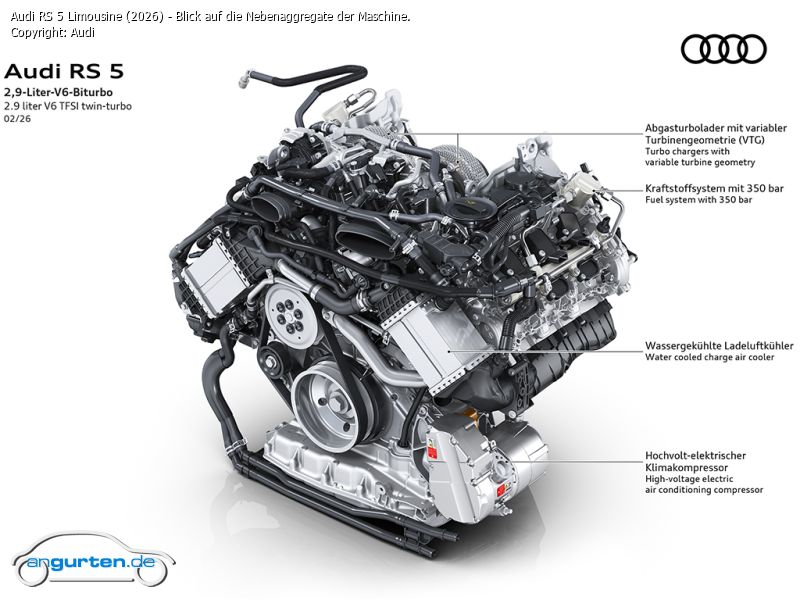 Audi RS 5 Limousine (2026) - Blick auf die Nebenaggregate der Maschine.