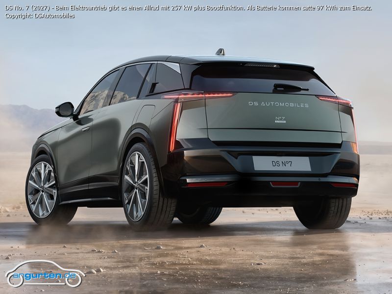 DS No. 7 (2027) - Beim Elektroantrieb gibt es einen Allrad mit 257 kW plus Boostfunktion. Als Batterie kommen satte 97 kWh zum Einsatz.