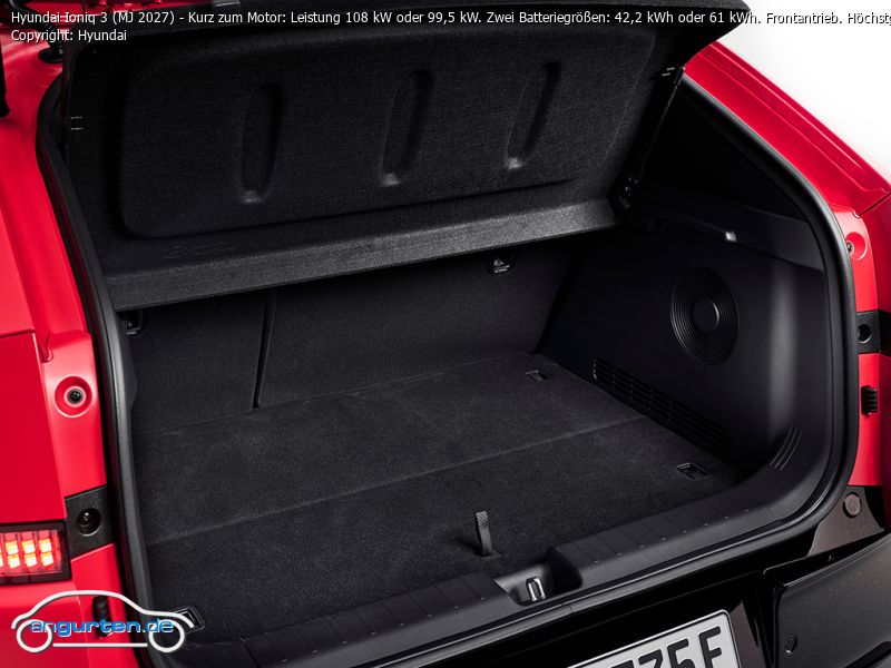 Hyundai Ioniq 3 (MJ 2027) - Kurz zum Motor: Leistung 108 kW oder 99,5 kW. Zwei Batteriegrößen: 42,2 kWh oder 61 kWh. Frontantrieb. Höchstgeschwindigkeit 165 km/h