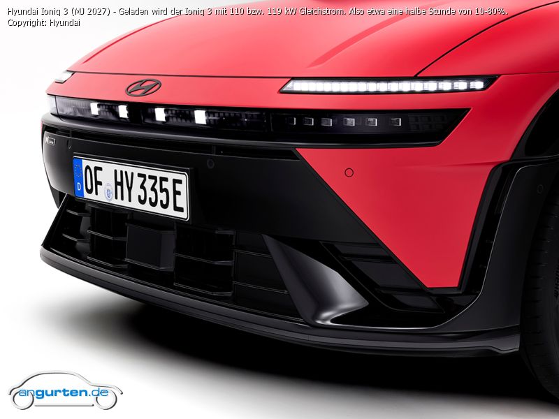 Hyundai Ioniq 3 (MJ 2027) - Geladen wird der Ioniq 3 mit 110 bzw. 119 kW Gleichstrom. Also etwa eine halbe Stunde von 10-80%.