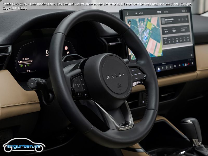 Mazda CX-5 2026 - Eine runde Sache: Das Lenkrad kommt ohne eckige Elemente aus. Hinter dem Lenkrad natürlich ein Digital Cockpit.