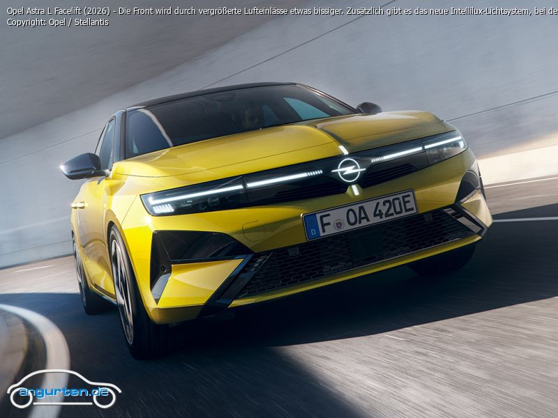 Opel Astra L Facelift (2026) - Die Front wird durch vergrößerte Lufteinlässe etwas bissiger. Zusätzlich gibt es das neue Intellilux-Lichtsystem, bei dem Opel nach eigenen Angaben mehr als 50.000 Pixel in den Scheinwerfern verbaut hat.