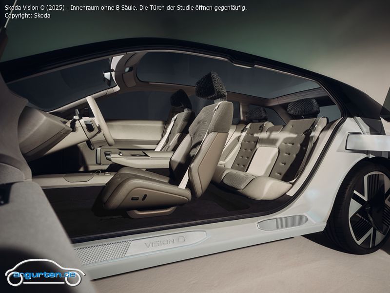 Skoda Vision O (2025) - Innenraum ohne B-Säule. Die Türen der Studie öffnen gegenläufig.