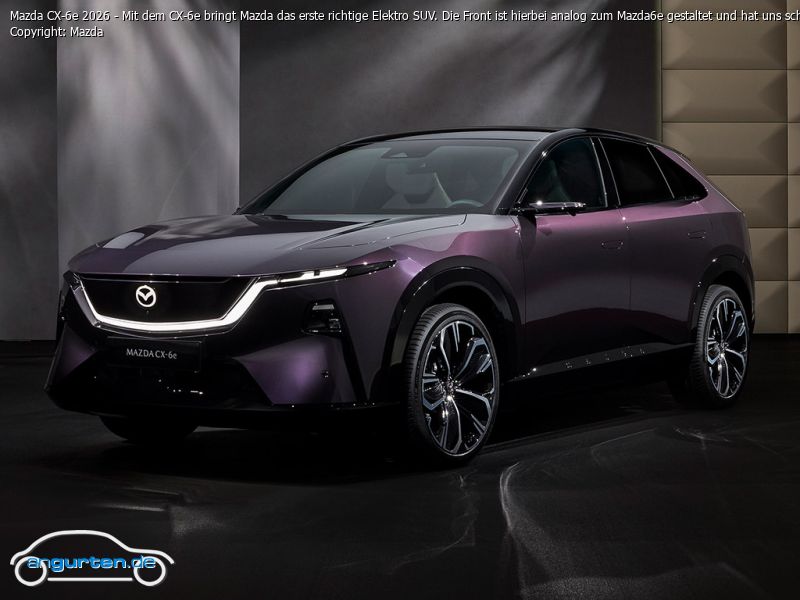 Mazda CX-6e 2026 - Mit dem CX-6e bringt Mazda das erste richtige Elektro SUV. Die Front ist hierbei analog zum Mazda6e gestaltet und hat uns schon bei der Mittelklasse-Limousine gut gefallen.