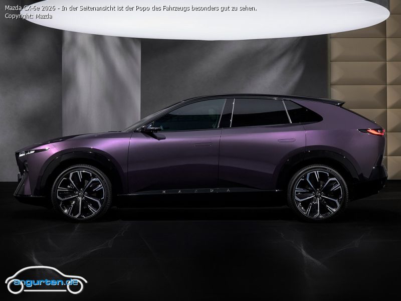 Mazda CX-6e 2026 - In der Seitenansicht ist der Popo des Fahrzeugs besonders gut zu sehen.